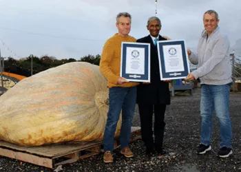 இங்கிலாந்து : ஆயிரம் கிலோவுக்கு அதிகமான எடை கொண்ட பூசணிக்காய் – கின்னஸ் உலக சாதனை படைத்த விவசாயிகள்!