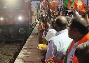 அம்பத்தூர் ரயில் நிலையத்தில் நின்று செல்லும் ஜோலார்பேட்டை விரைவு ரயிலை மலர்தூவி வரவேற்ற பாஜகவினர்