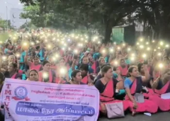 பெரம்பலூர் ஆட்சியர் அலுவலகம் அருகே செல்போன் டார்ச் அடித்து அங்கன்வாடி பணியாளர்கள் போராட்டம்!